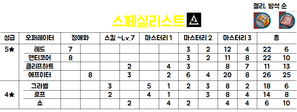 뱅가드부터 스나이퍼 가드 캐스터 디펜더 메딕 스페셜리스트 서포터 순입니다.