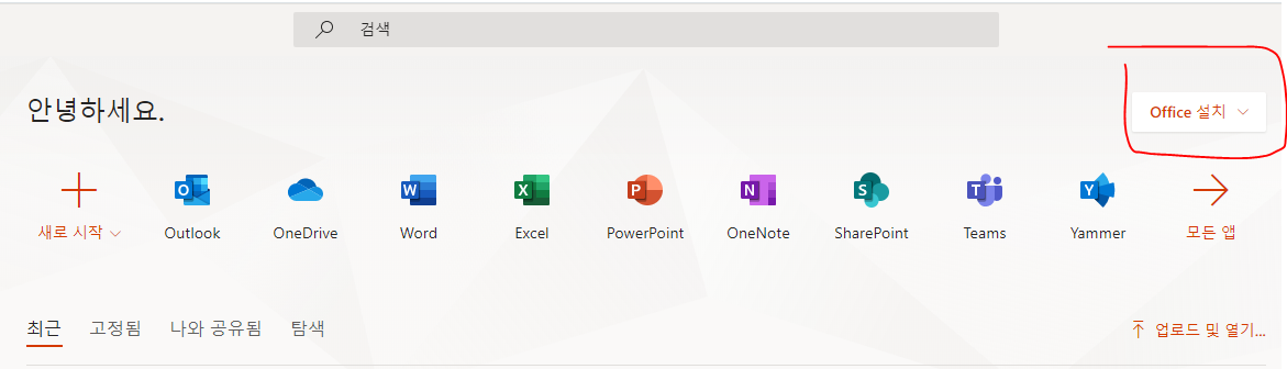 가운데 상단에 Office 설치가 나와있을겁니다.