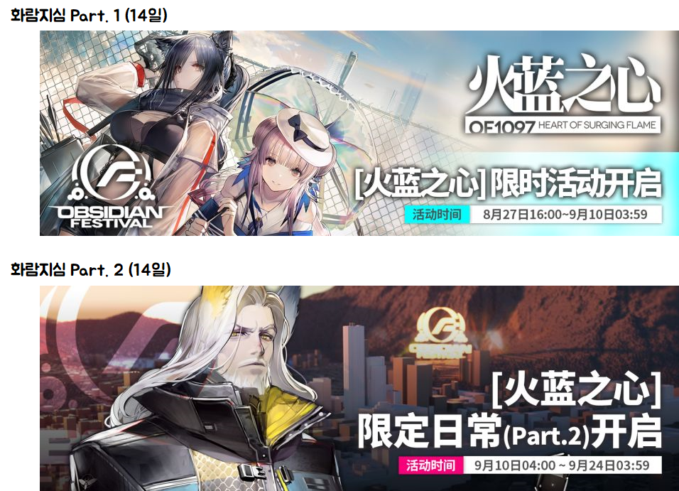 ※ 화람지심 Part. 1 Part. 2 둘 모두 일일 퀘스트 중 일부가 이벤트 관련 보상을 주는 특별 임무로 변경
