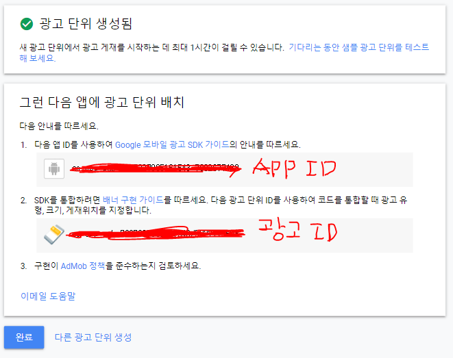※주의할 점 : 광고 ID는 ca-app-pub-숫자*(/) 숫자 형식입니다.