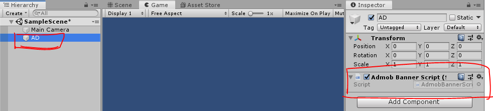 아까 생성한 빈 오브젝트 AD에 스크립트를 추가해주시면 배너 광고 생성 완료!