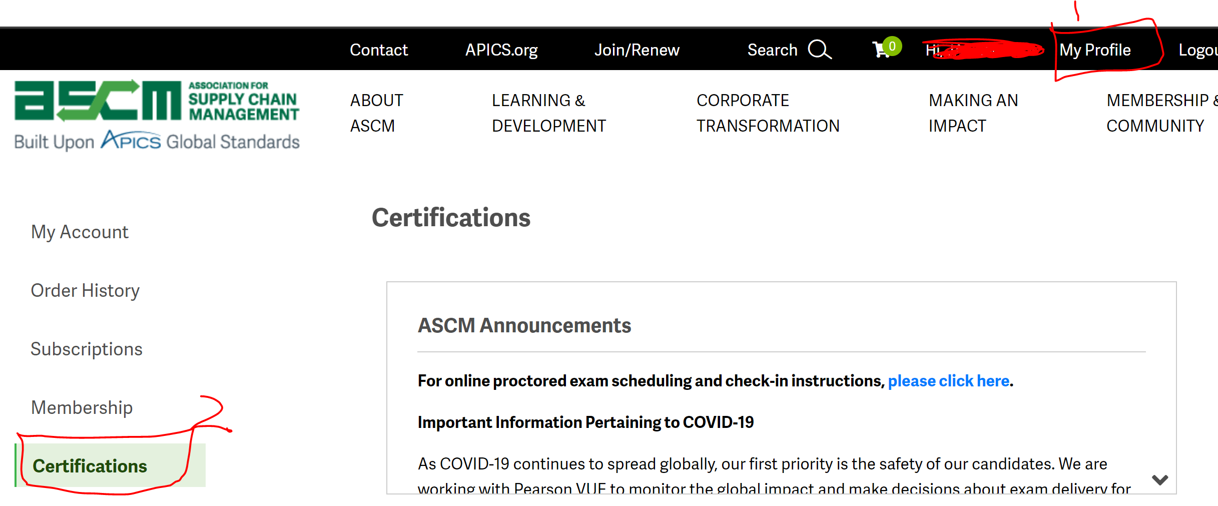 ASCM 홈페이지 로그인 - My Page - Certification