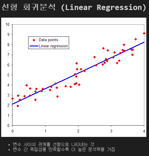변수사이의 관계를 선형으로 나타내는 것을 선형 회귀분석이라 합니다.