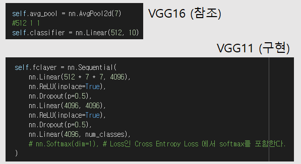 Fully Connected Layer로 4096, 4096, num_classes = 1000으로 세 개의 층을 쌓았고