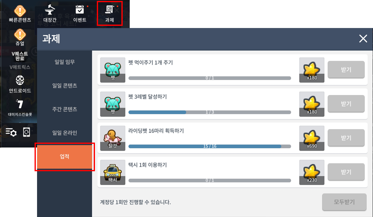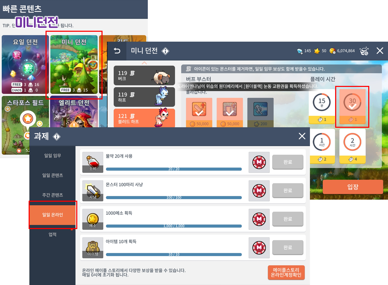 미니던전에서 30분 돌리고나서 좀 있다가 접속하면, 과제의 일일온라인 탭이 클리어가 되어있을 겁니다