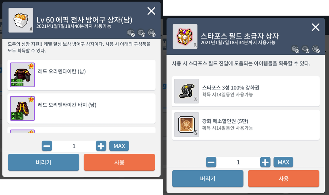 60레벨 달성 후 이벤트 - 모두의 성장지원에서 에픽 방어구와 스타포스 강화권, 강화메소 할인권을 받을 수 있습니다.