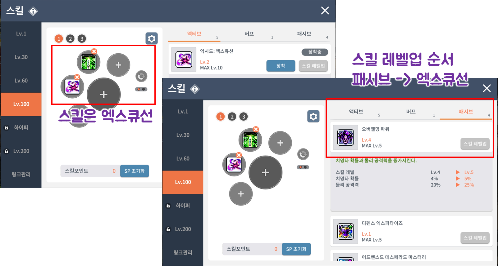 100부턴 자동분배가 되지 않기 때문에, 패시브 먼저 레벨업하고, 액티브스킬 엑스큐선을 마스터해주시면 됩니다.