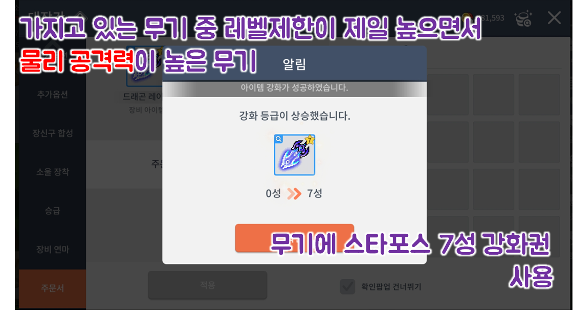 물리공격력이 높은 것으로 7강 스타포스 강화를 해주시면 됩니다.