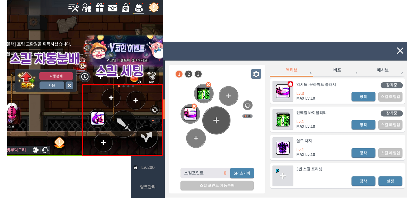 우선 스킬 세팅부터 해줍니다. (스킬 자동분배는 틈틈히)