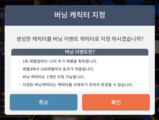 또한, 생성시 버닝 캐릭터로 지정해주도록 합니다 !