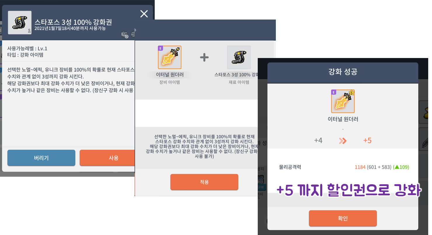 스타포스 3성 강화권 + 강화 할인권으로 장비를 강화해주시면 됩니다.