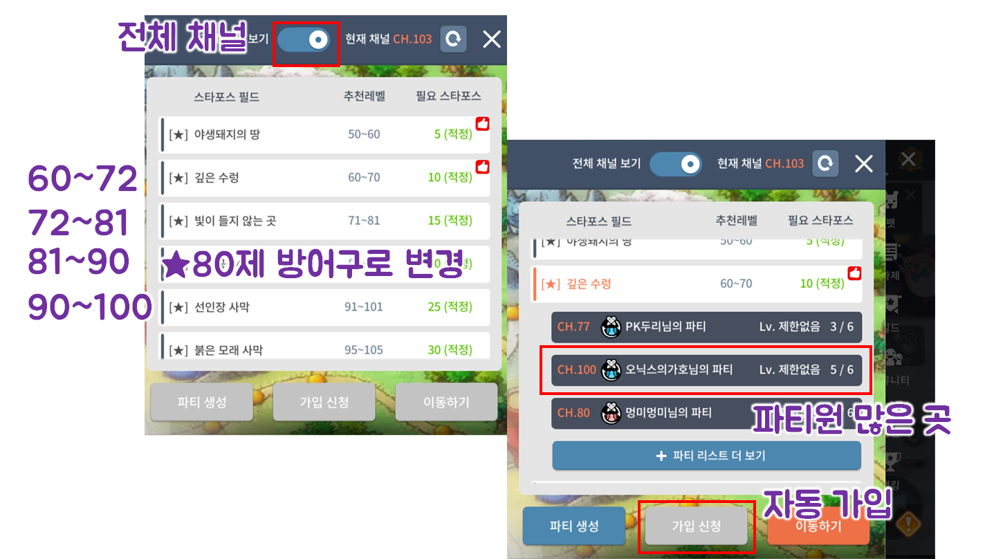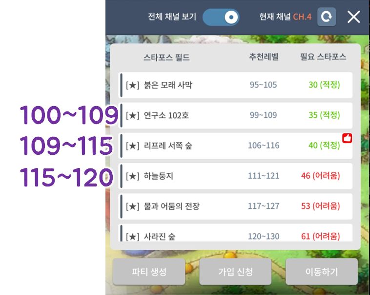 해당 사냥터에 파티가 마땅치 않을 경우 (3명 정도) 그냥 이전 맵 풀파티에서 사냥하는 것이 훨씬 빠릅니다.