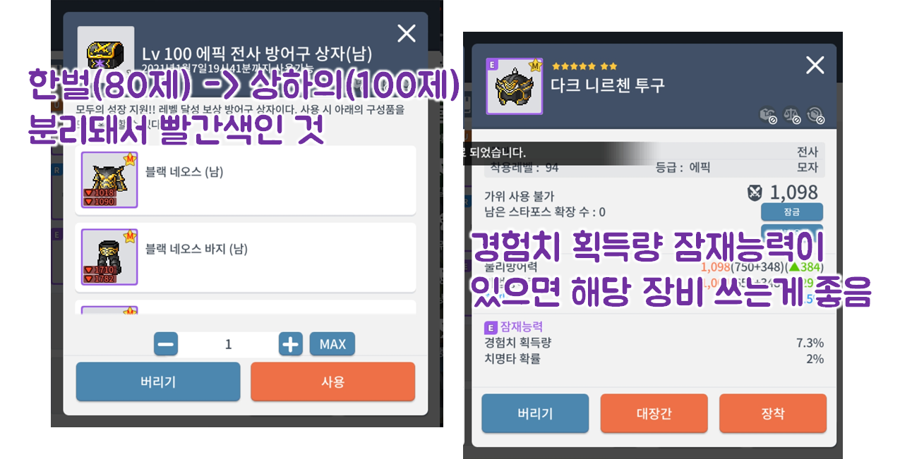 잠재능력을 확인했을 때, 경험치 획득량이 붙어있다면 해당 장비 사용하시는게 더 좋습니다 !