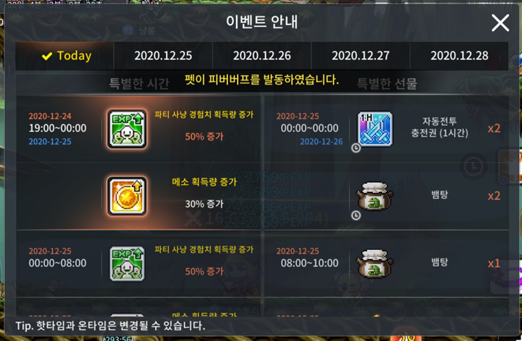 특정 시간대에 경험치 획득량 증가 버프를 받으실 수 있습니다.