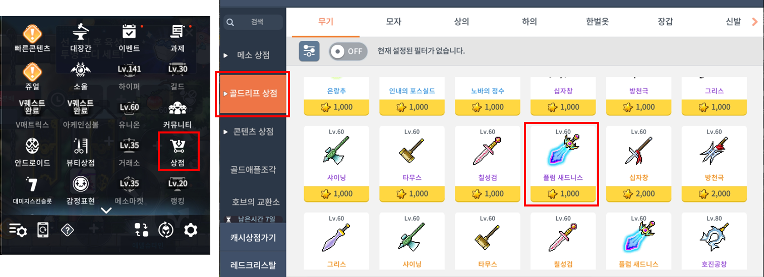 상점에서 골드리프 상점을 들어가서 60제 무기를 구매하신 뒤,