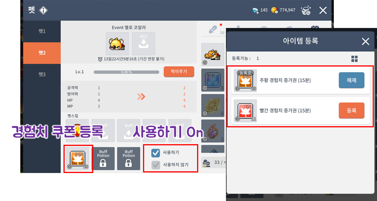 또한, 펫에 경험치 쿠폰을 등록하고, 사용하기를 On으로 해놓으시면