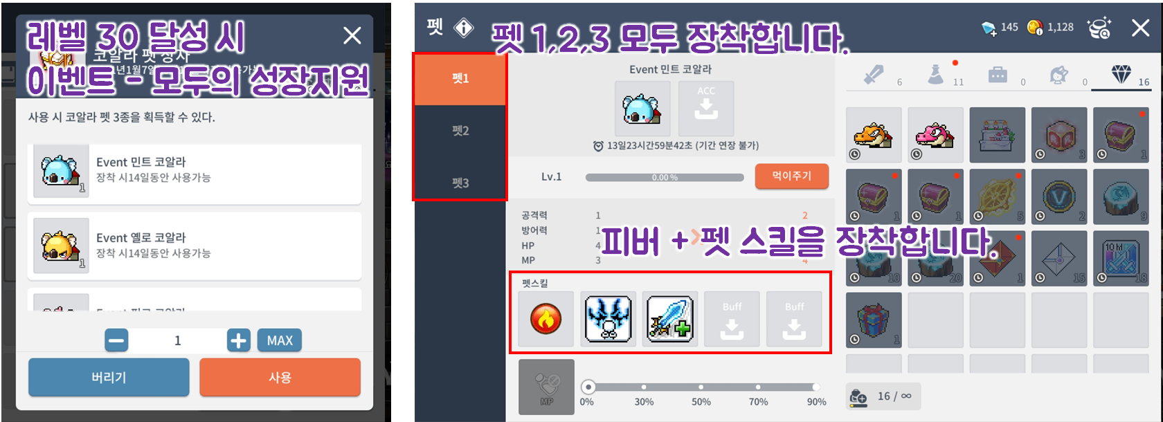 레벨 30을 달성하시고나서 이벤트 - 모두의 성장지원에서 펫을 받고 장착하시면 됩니다.