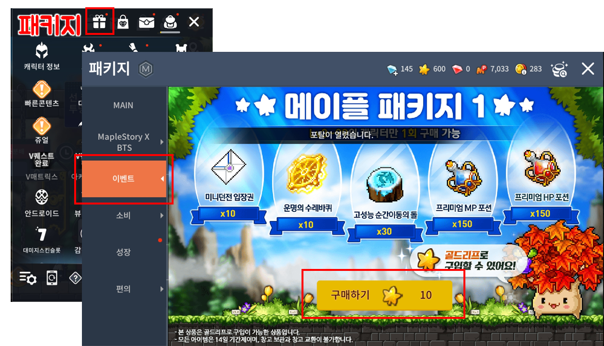 패키지에서 이벤트로 가셔서 아래쪽에 메이플 패키지 1,2,3이 나올떄마다 구매하시면 됩니다.