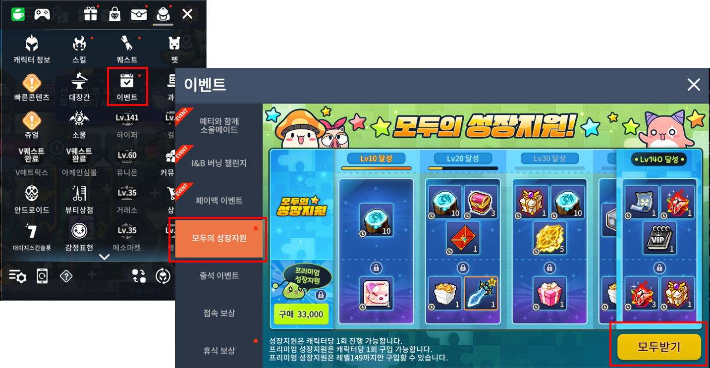 장비랑 각종 다양한 아이템을 지원해주는 모두의 성장지원 입니다.
