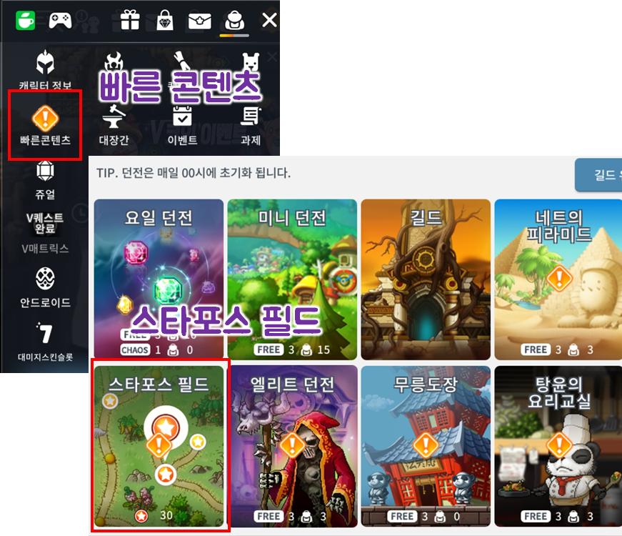 빠른 콘텐츠, 스타포스 필드를 눌러서 자동사냥할 곳을 선택합니다.