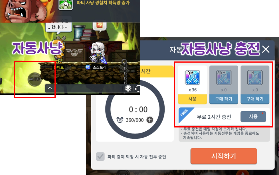 좌측 하단에 자동사냥을 눌러 자동사냥 시간을 충전하면 준비 끝 !