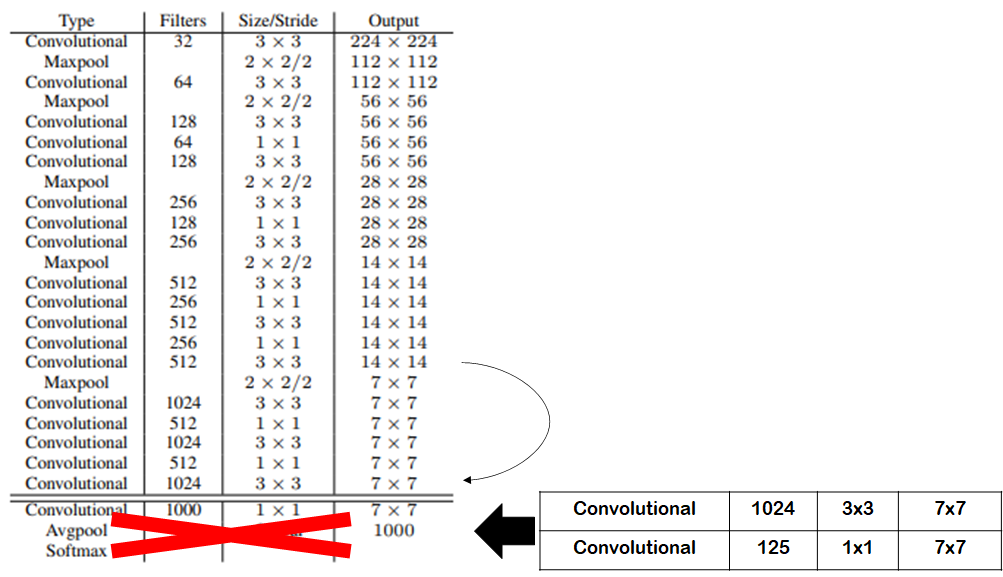 Darknet의 마지막 conv layer를 제거하고 3x3 1024, 1x1 num_anchors * ( 5 + num_classes )의 layer를 추가합니다.