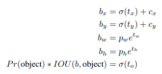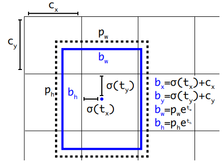 pw, ph라는 미리 정해진 anchor box의 width, height로, 예측한 box의 width, height와 계산하여