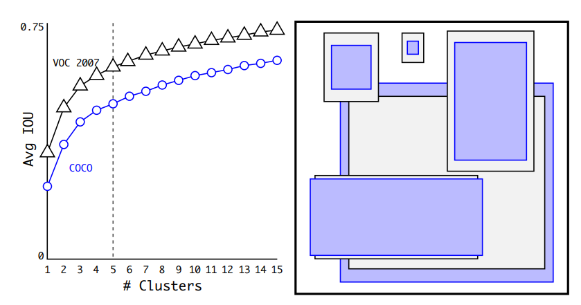 - training set의 bounding box로 K-means clustering을 활용, 최적의 Anchor box를 탐색 (5 anchor box)