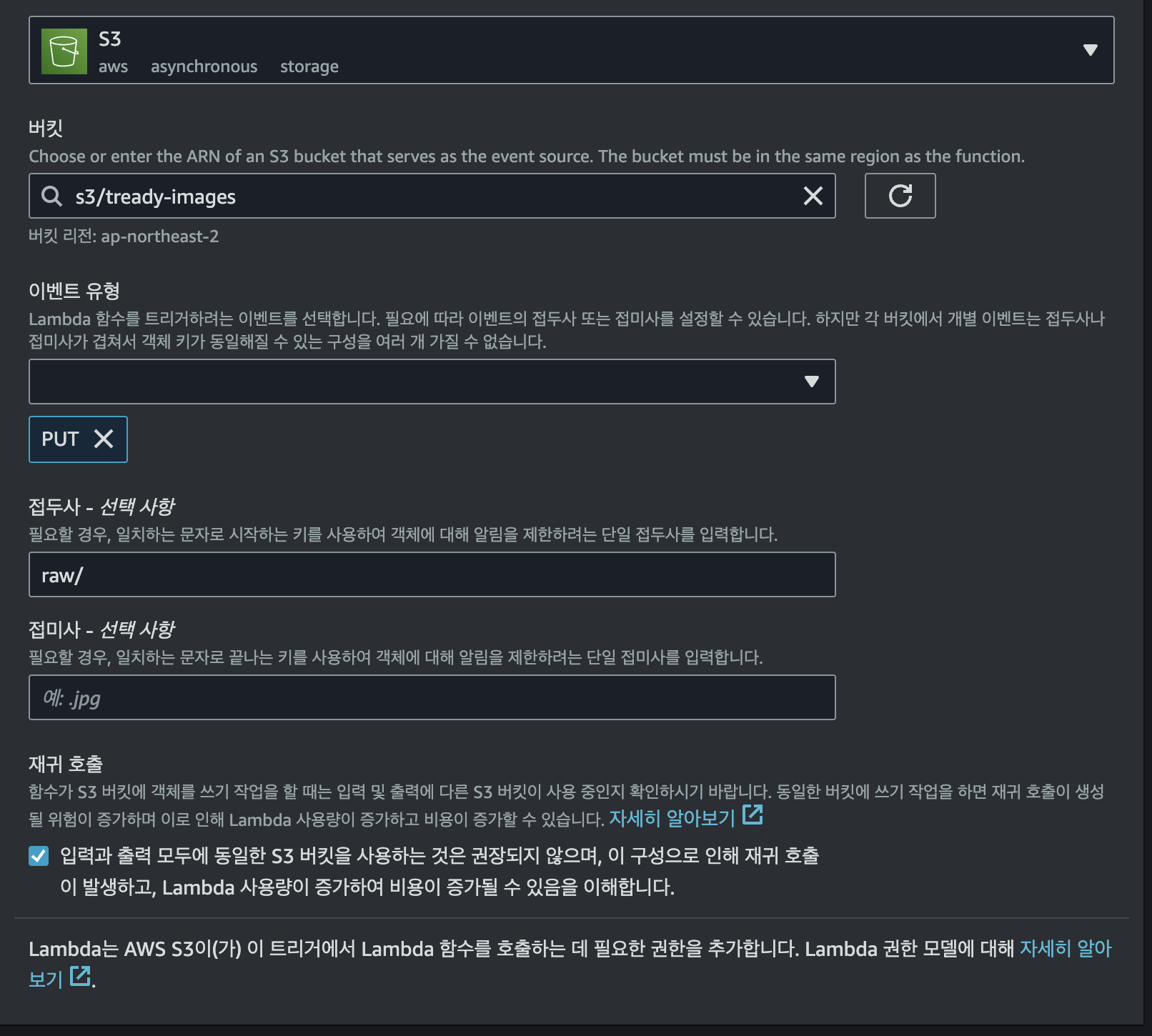 raw/ 폴더에 대해서 PUT이벤트가 발생했을 때만 실행하도록 트리거를 설정합니다.