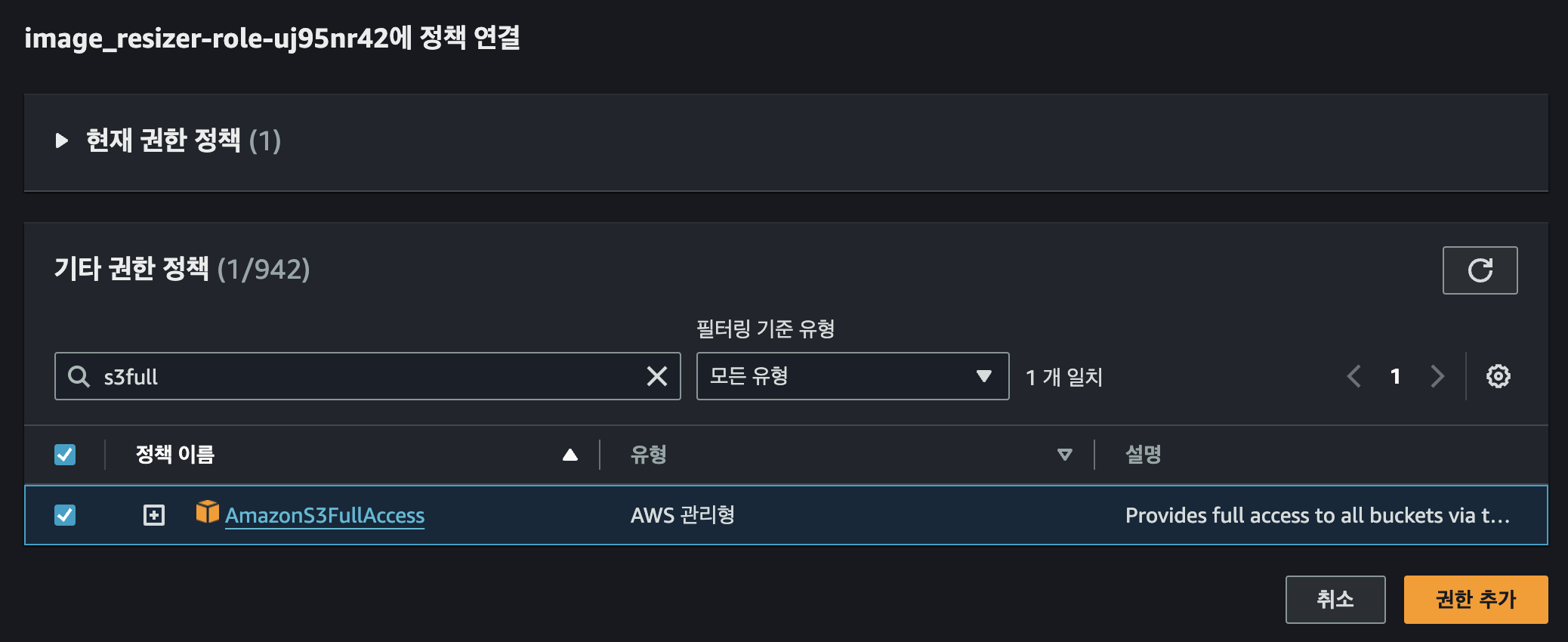 s3fullaccess를 검색하여 권한을 추가해줍니다.