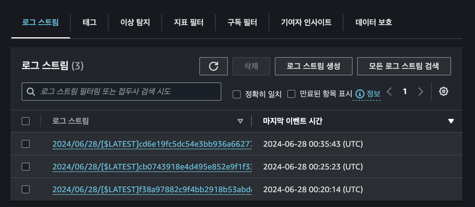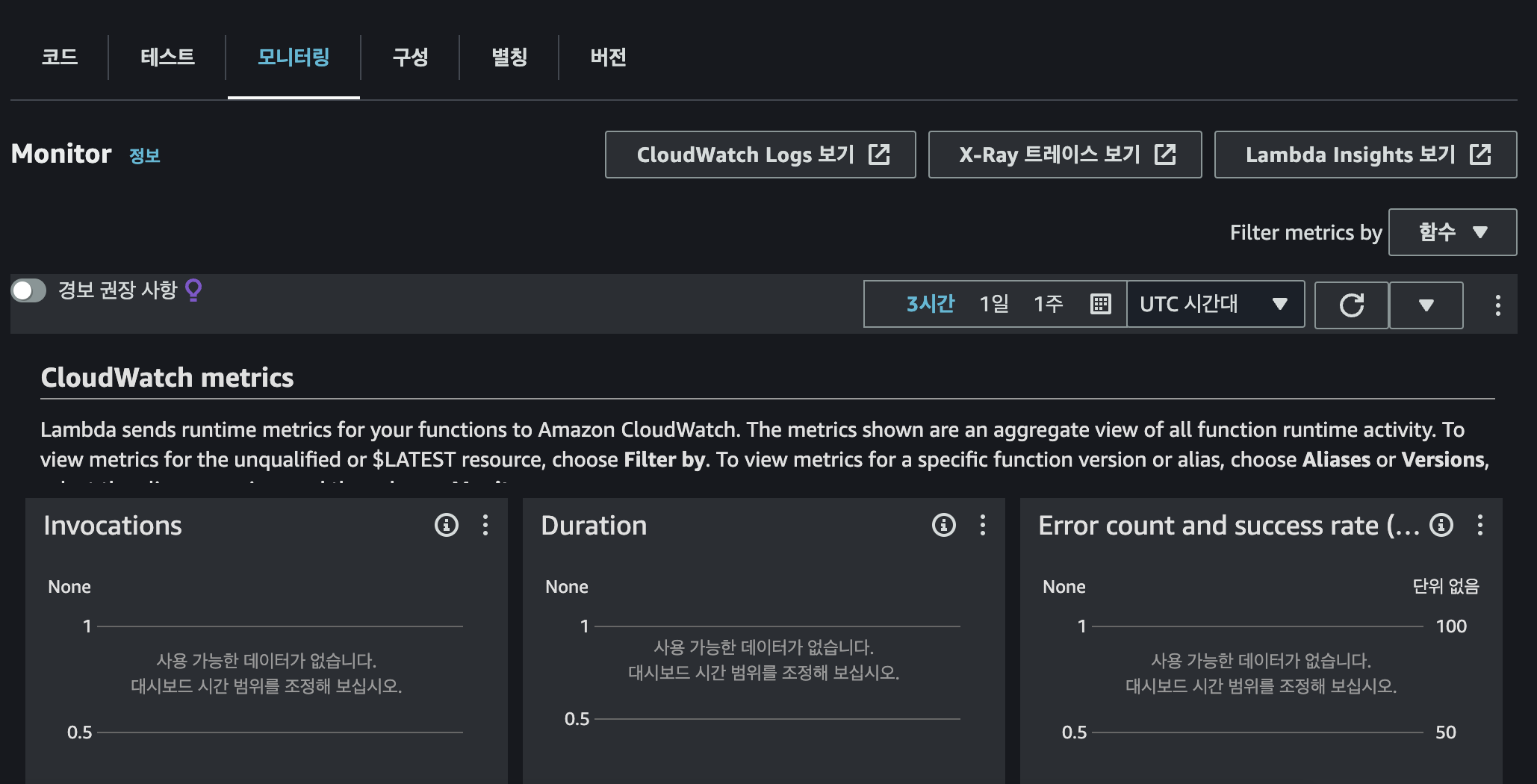 Lambda 함수 내 모니터링에서 CloudWatch Logs 보기를 통해 실행 결과를 확인할 수 있습니다.
