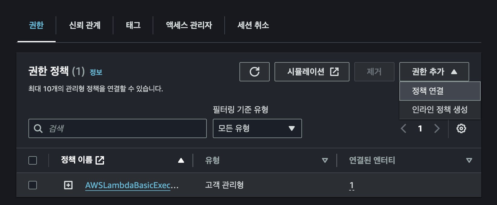 - Lambda에 S3권한 부여: [구성] - [권한]에서 역할 이름을 클릭하여 S3 정책을 추가합니다.