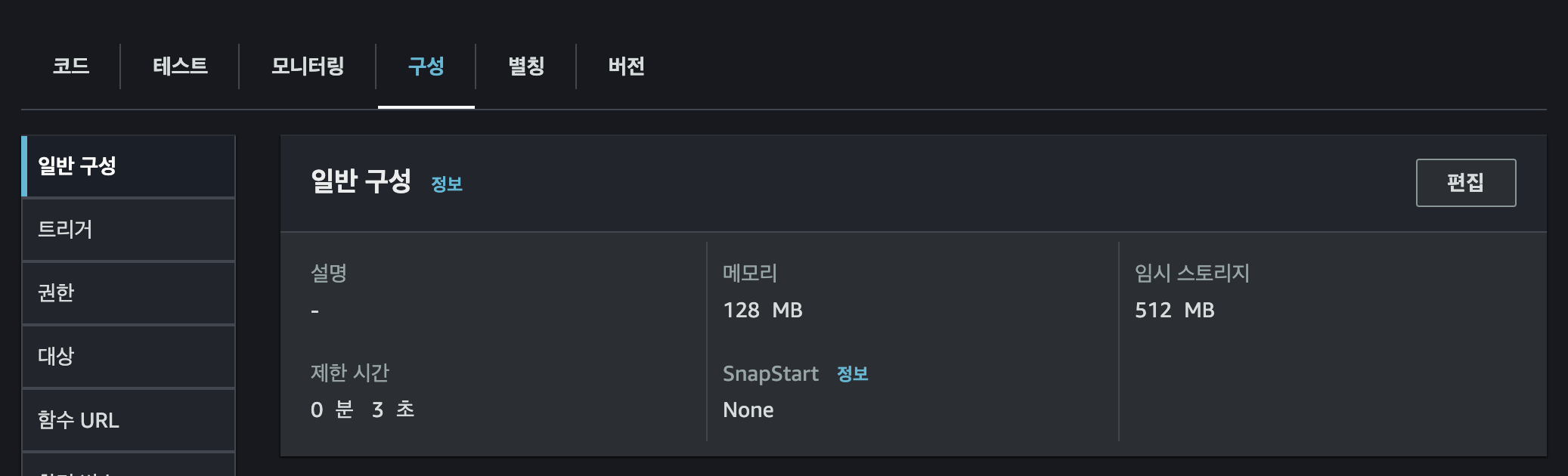 [구성] - [일반 구성]에서 편집을 통해 제한시간과 메모리, 임시스토리지 등등을 늘려주면서 확인하시면 됩니다.