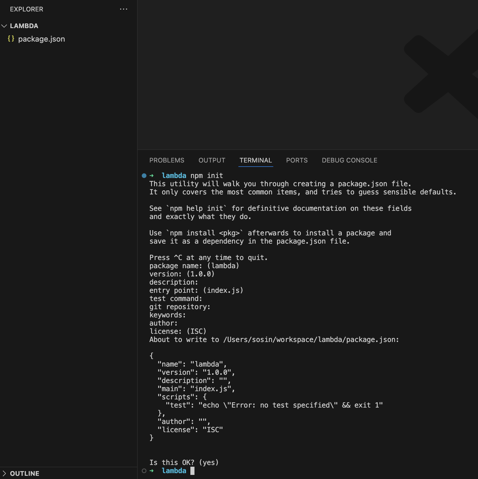 npm init: lambda 폴더를 만들고 해당 폴더 내부에서 터미널에npm init커맨드로 package.json을 생성합니다.