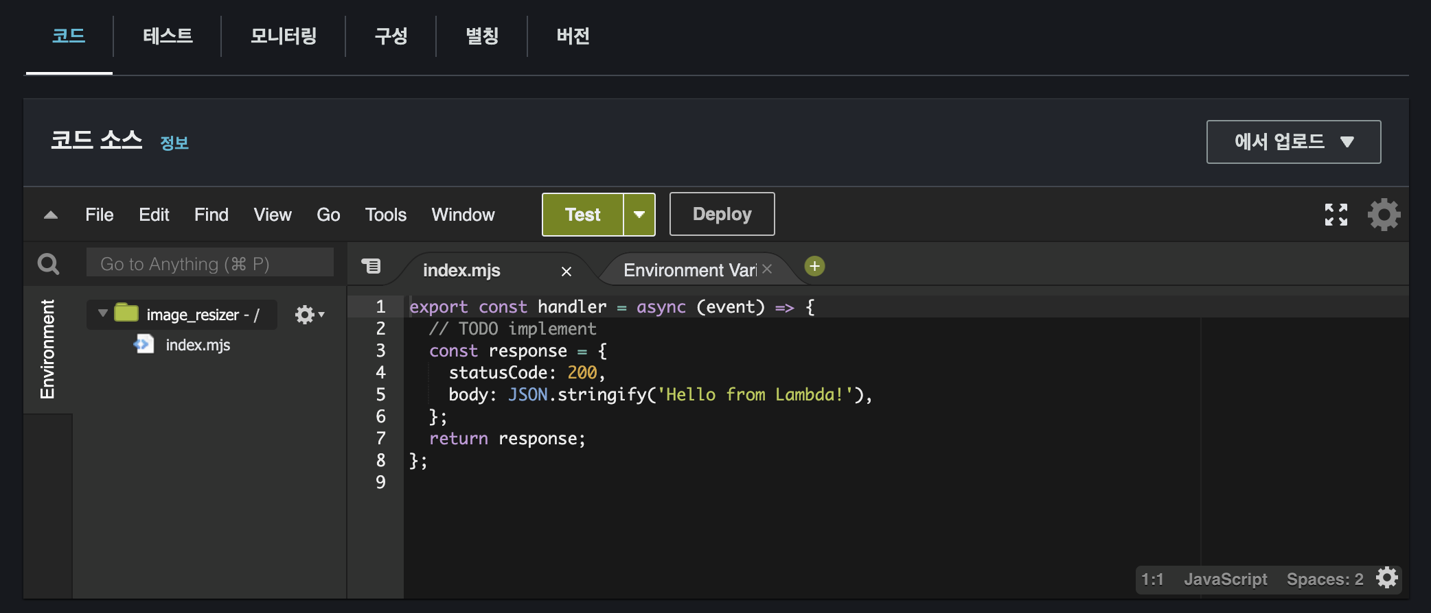 Lambda 함수는 Node.js로 구현되며, 이미지 처리를 위한 로직을 포함합니다. (Node.JS 환경 구성 필요)