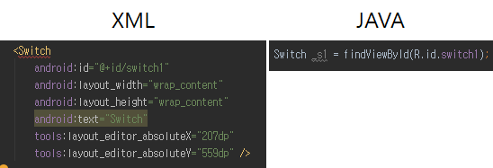XML의 @+id/switch1과 자바의 R.id.switch1은 서로 같은 것을 지칭합니다.