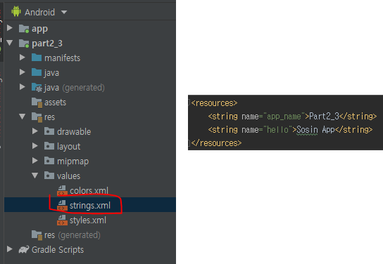 @string/hello는 자바에서 R.string.hello와 같습니다.