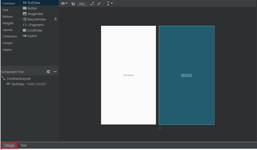 XML파일에서 Design을 누르면 드래그 & 드롭으로 각각의 요소들을 끌어다가 화면을 구성할 수 있습니다.
