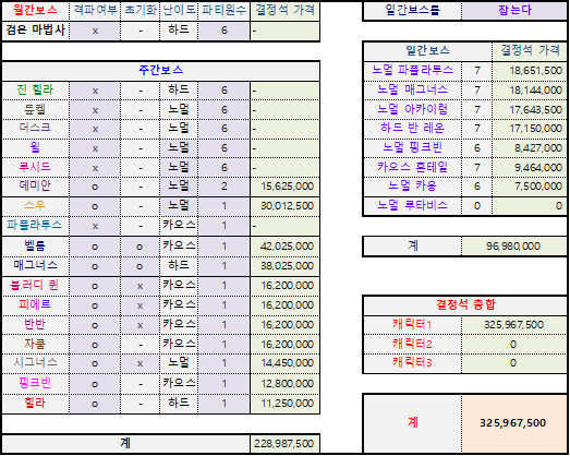 우선 일간보스 + 주간보스를 통해 얻는, 순수하게 결정석을 팔아 생기는 메소 순수익입니다.