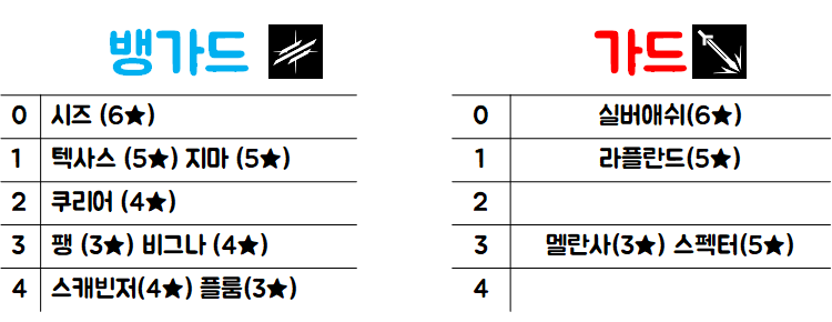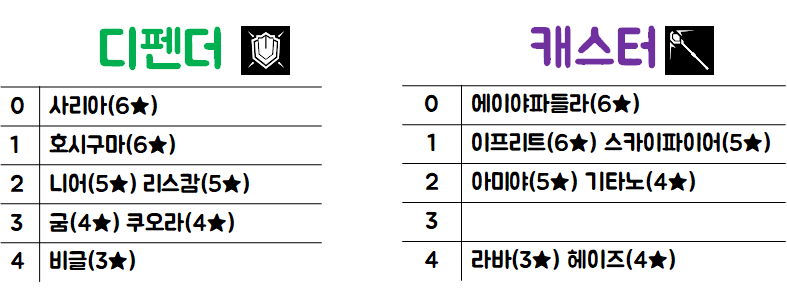 캐스터, 가드 우선 > 공격형 디펜더 > 뱅가드 > 방어형 디펜더 > 메딕